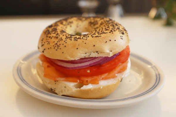 Nova, cream cheese, tomato & onion bagel is a sliced bagel sandwich with smoked salmon and sliced tomato and onion.