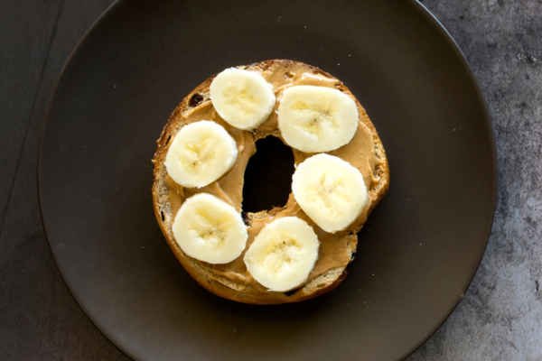 Peanut Butter & Banana Bagel is a sliced bagel sandwich with peanut butter and sliced banana.