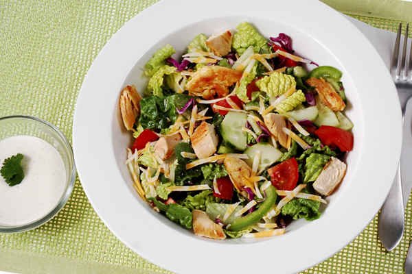 Romaine lettuce, grilled chicken, green peppers, cucumbers, tomatoes, carrots and onions.