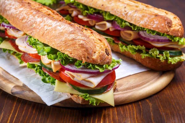 Ham, turkey, roast beef, Swiss cheese, American cheese, lettuce and tomato on a 6 foot hero.