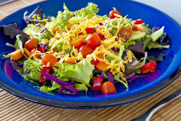 Mixed garden salads are made with a base of lettuce or mixed greens, tossed with assorted veggies and served with a dressing.