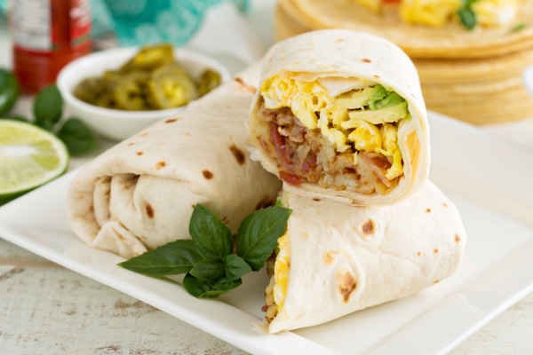 An assortment of egg, cheese and home fries burritos, mixed with…